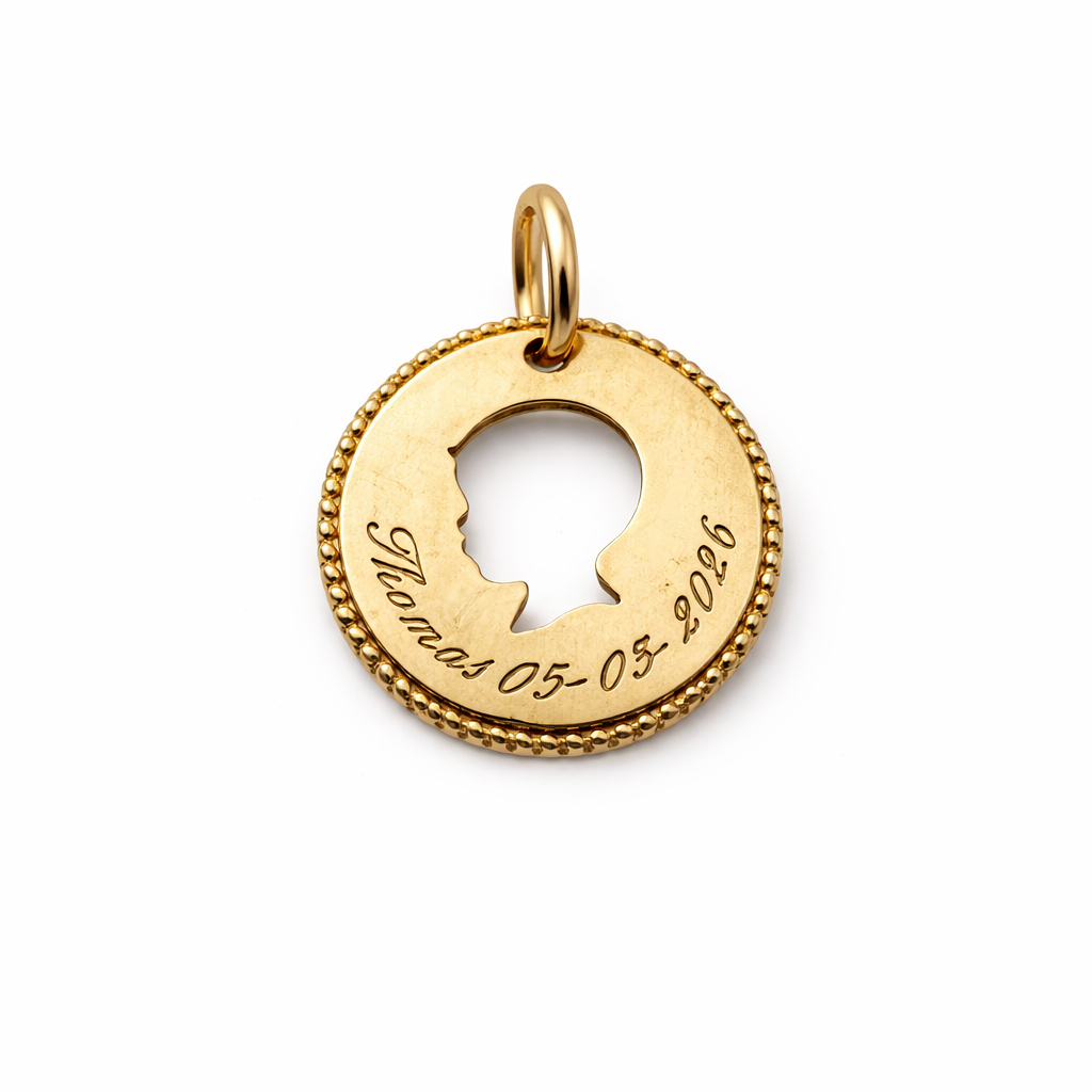 Tijdloos en persoonlijk: deze 14 karaat geelgouden Vintage Family Coin met uitgesneden silhouet heeft een klassieke en verfijnde uitstraling. Het profiel wordt open verwerkt in de munt, wat zorgt voor een subtiel en herkenbaar design met een persoonlijke touch. De voorzijde kan eventueel worden voorzien van een naam en/of datumgravure, wat het sieraad extra persoonlijk maakt.