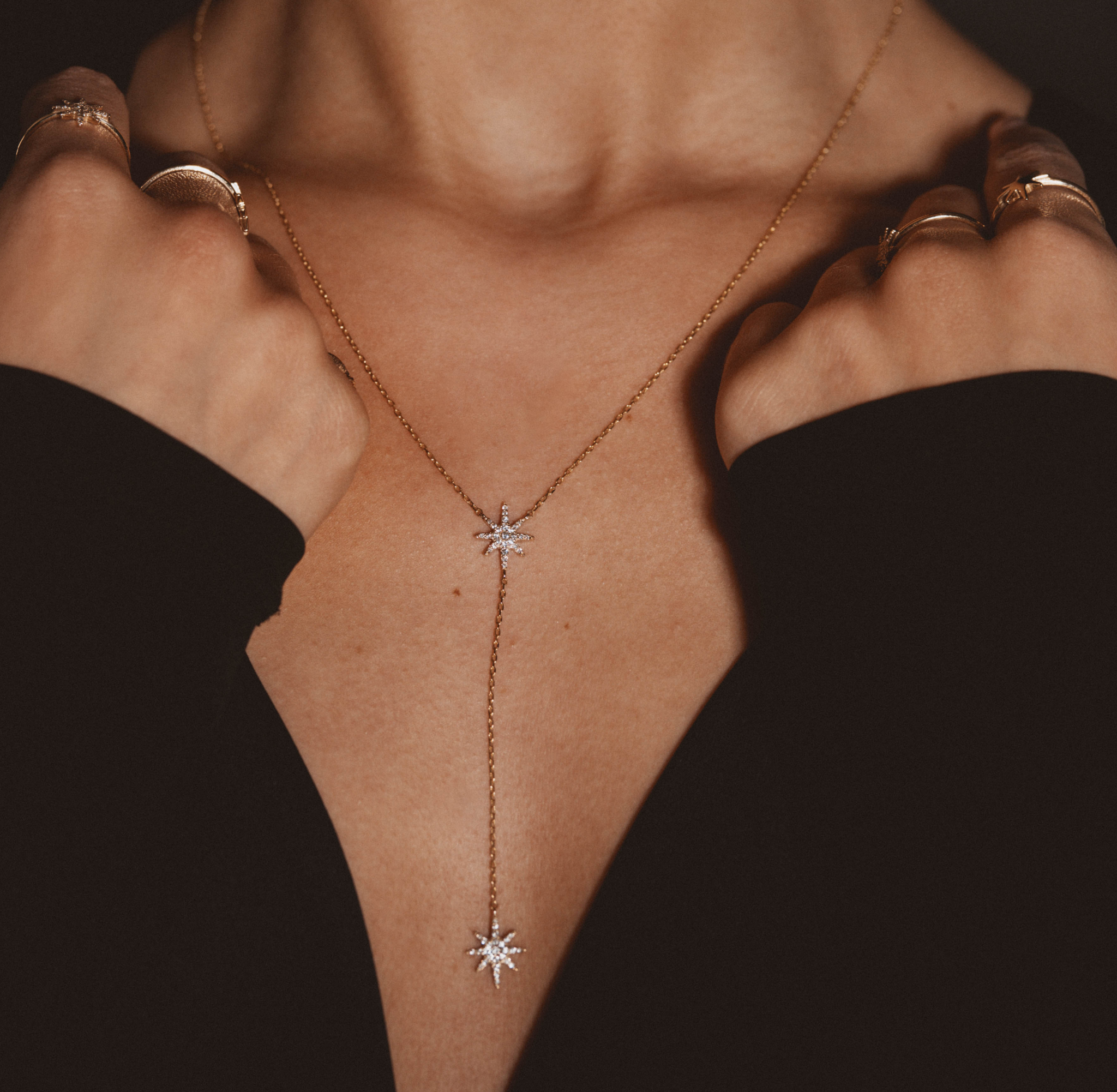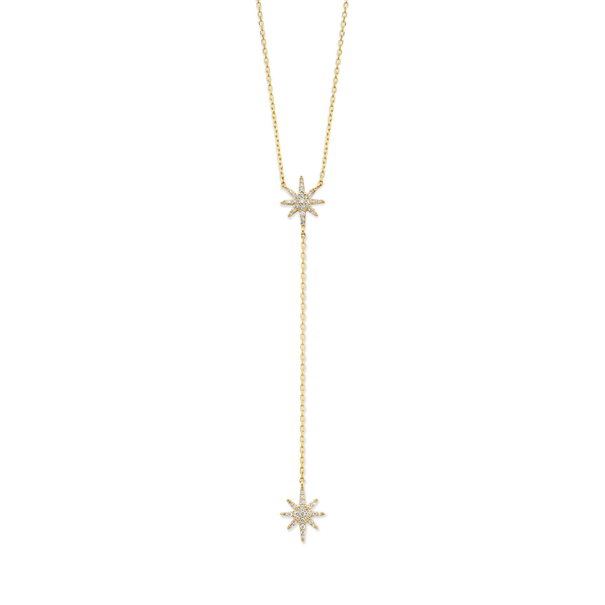 Voeg een sprankelende touch toe aan je sieradencollectie met de Universe Dubbele Diamant Ster Ketting. Deze elegante ketting, vervaardigd uit 14 karaat geelgoud, heeft een stijlvol Y-vormig ontwerp met twee stervormige hangers, elk bezet met schitterende witte diamanten van hoge kwaliteit (SI1 G/H Top White).